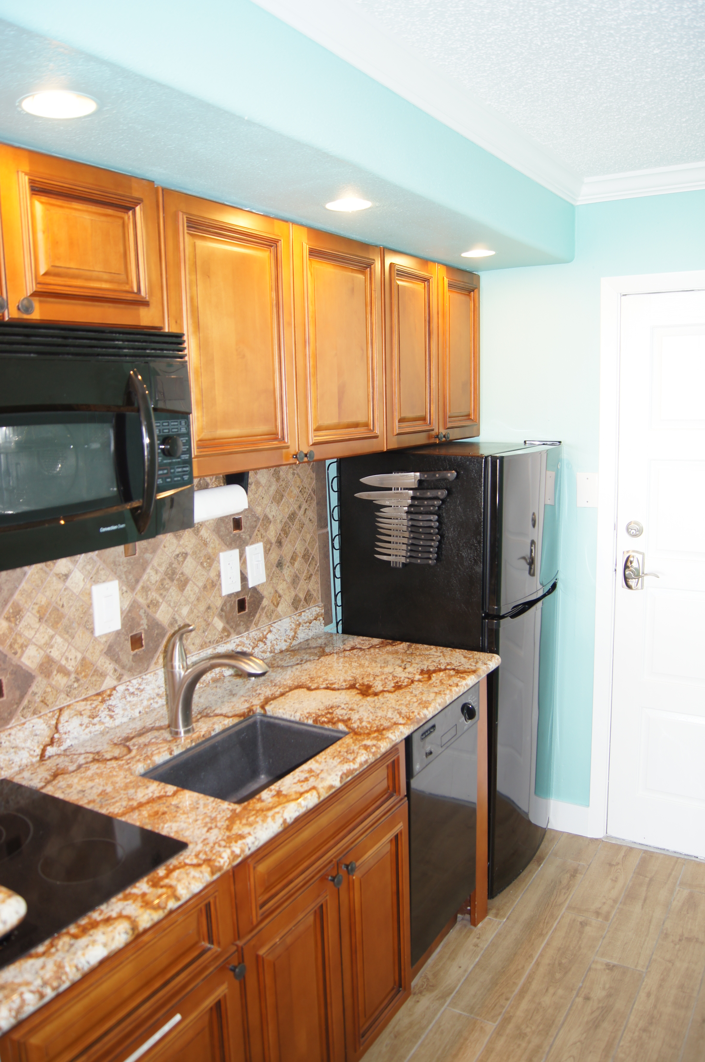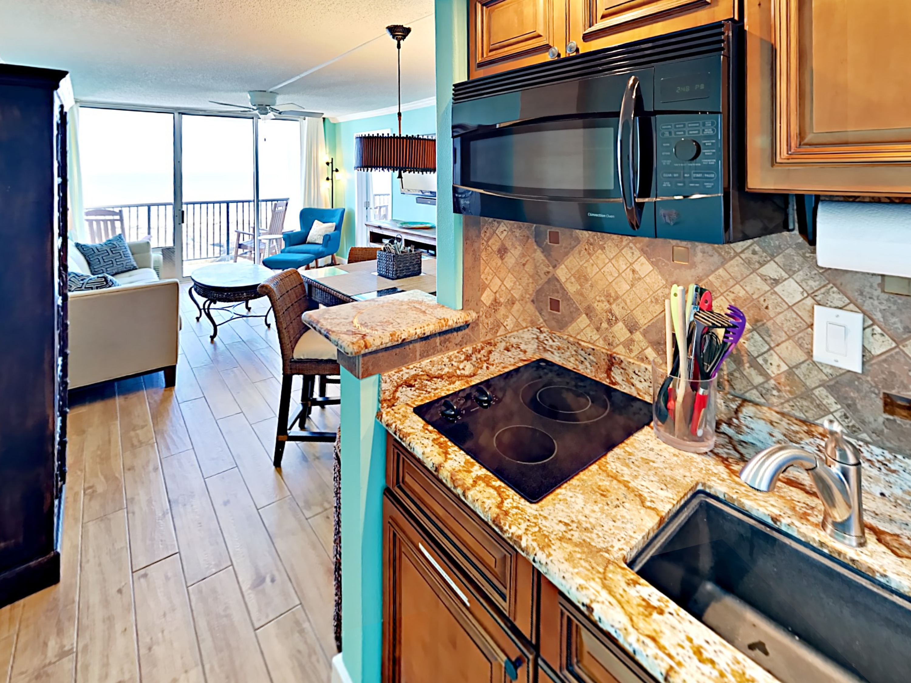 The space-efficient kitchen has a refrigerator and freezer, two-burner cook top, and convection microwave oven (works like an oven or microwave). We include dishes, glassware, kid-friendly cups and drinks, pots, pans, and other items like a Keurig coffee maker, toaster, and blender.