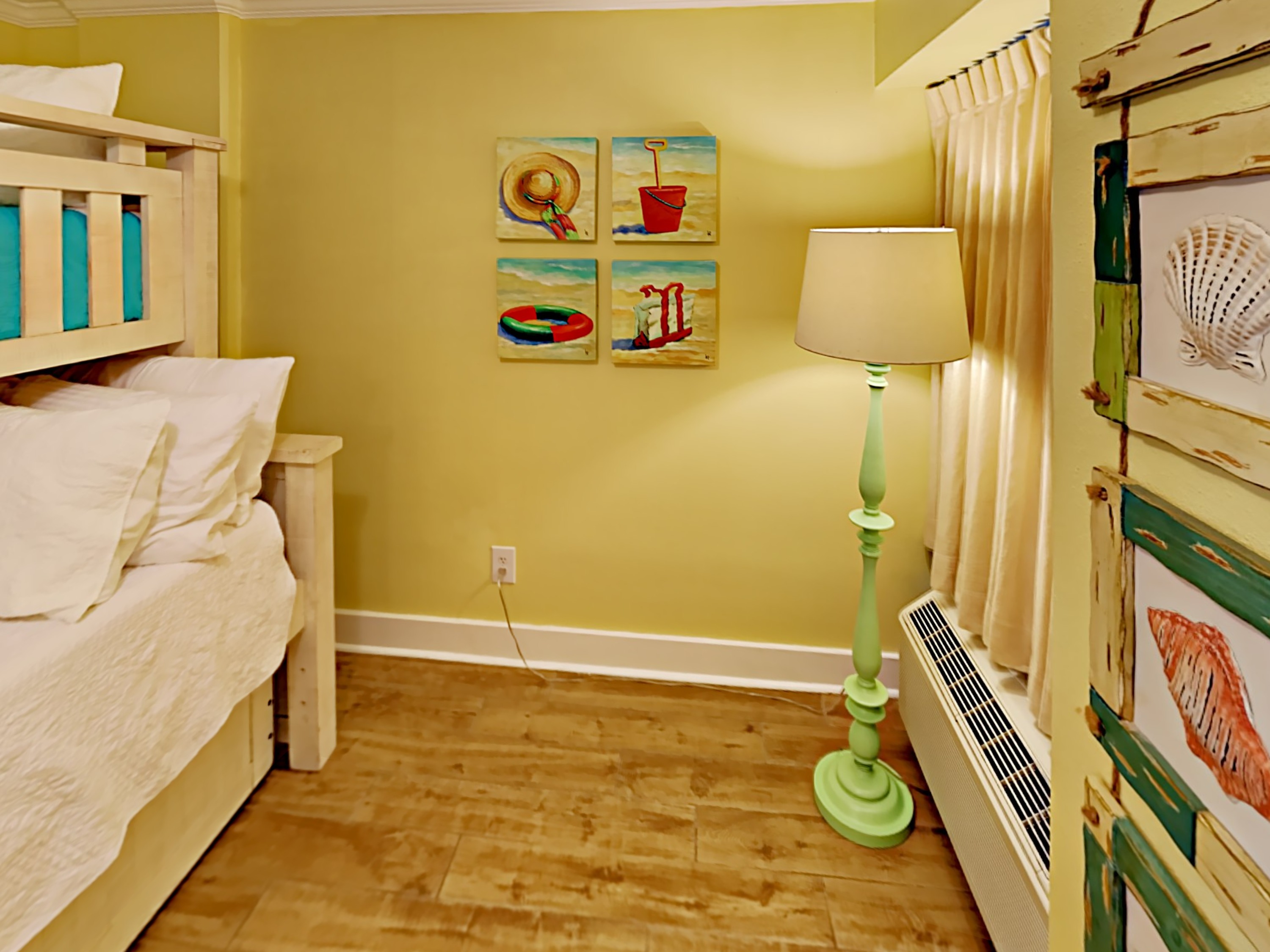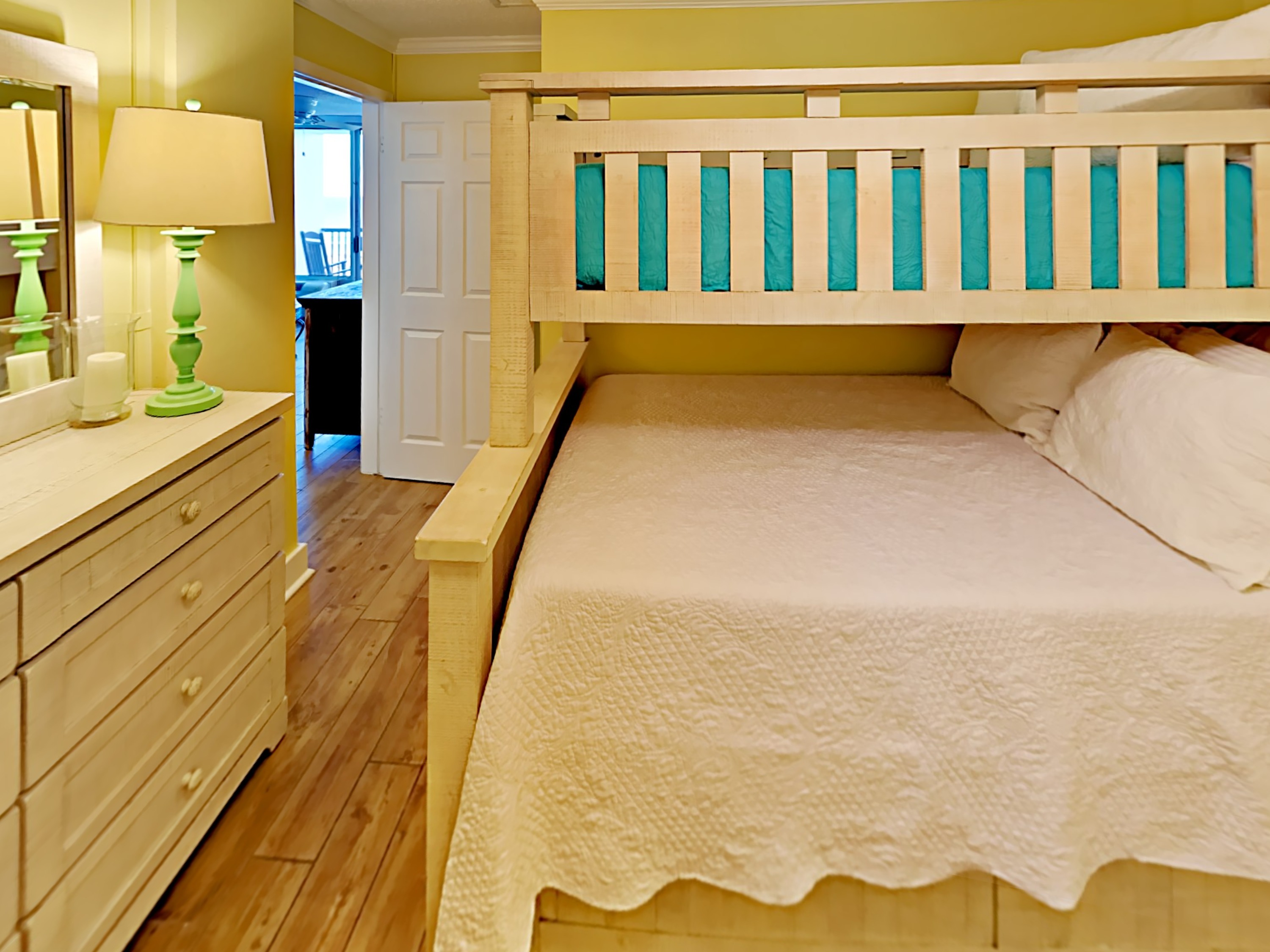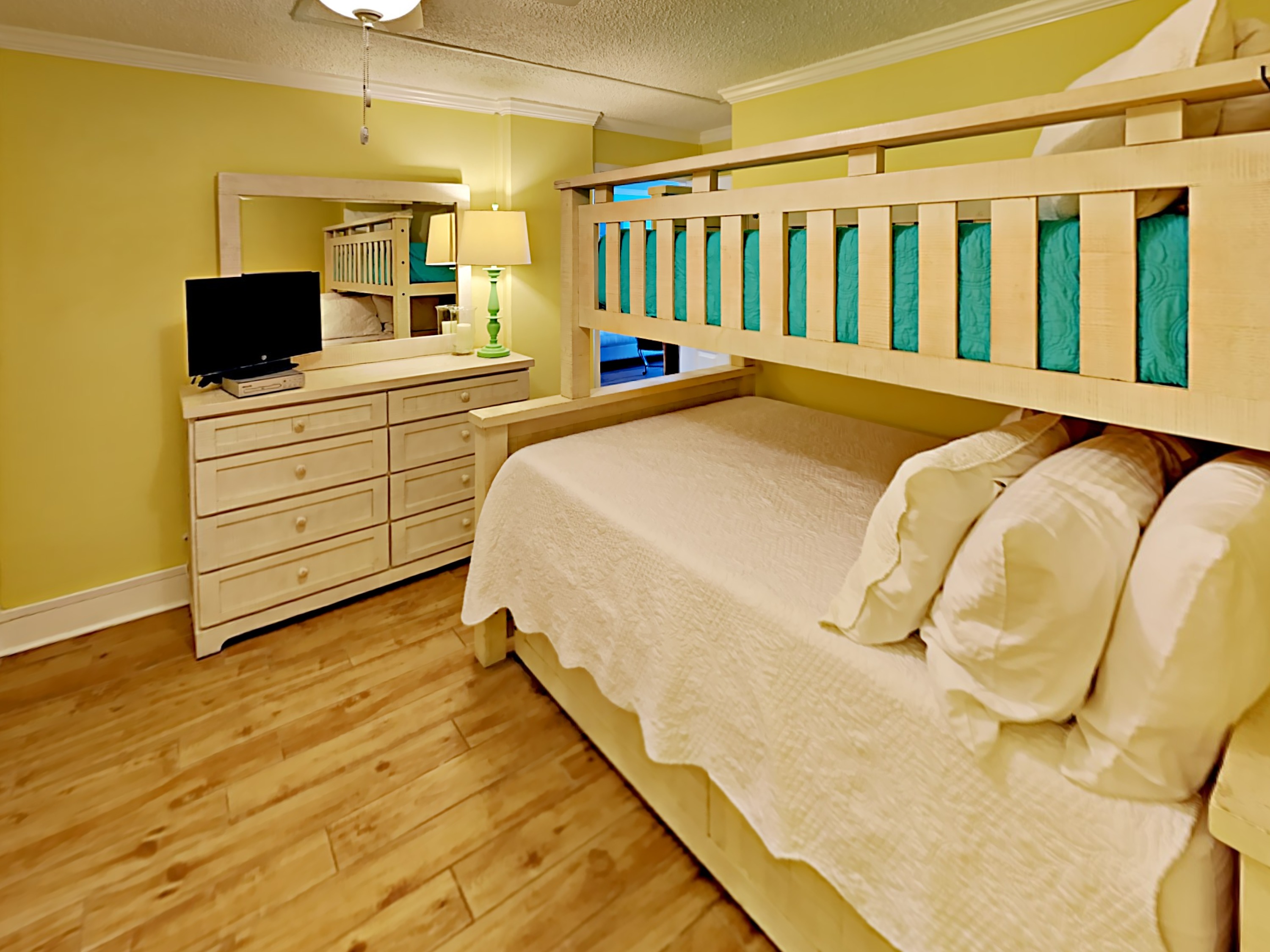 This cheerful room has a bunk bed with a trundle – so that’s a twin on the top, double bed in the middle, and a twin trundle bed which pulls out for when you have a full house.