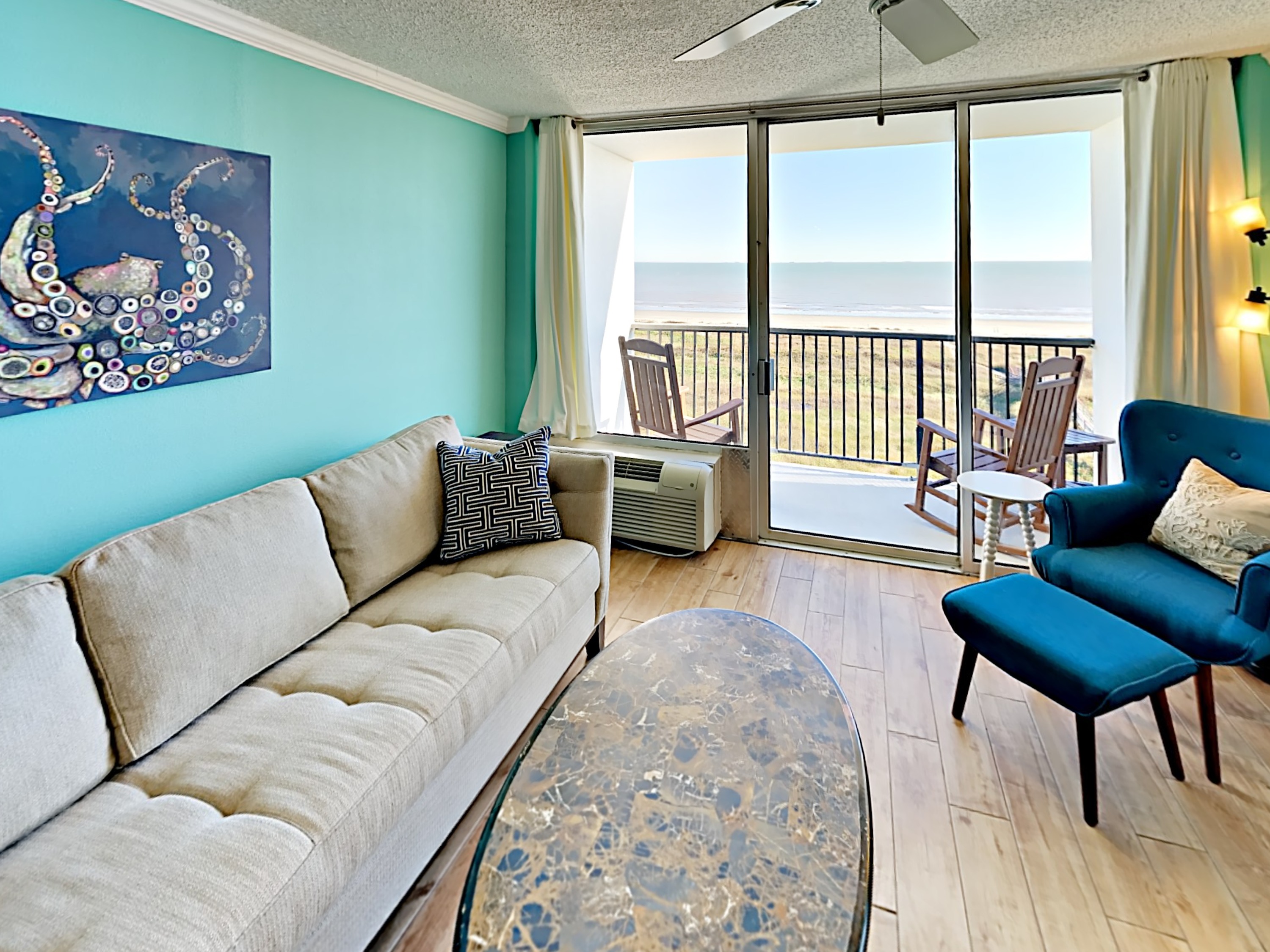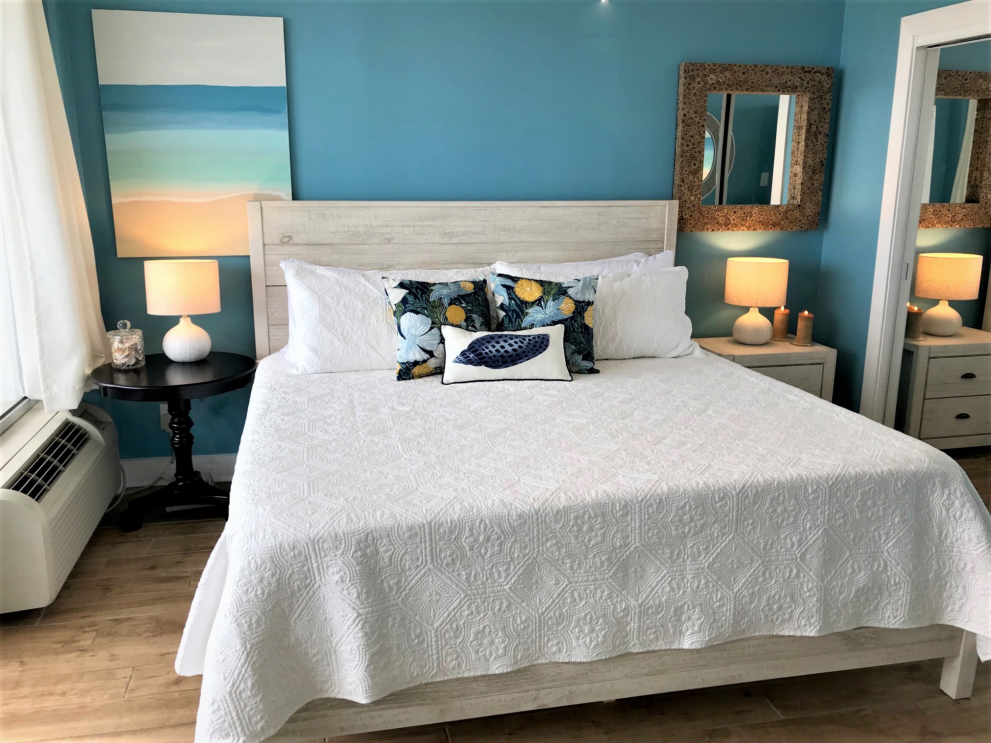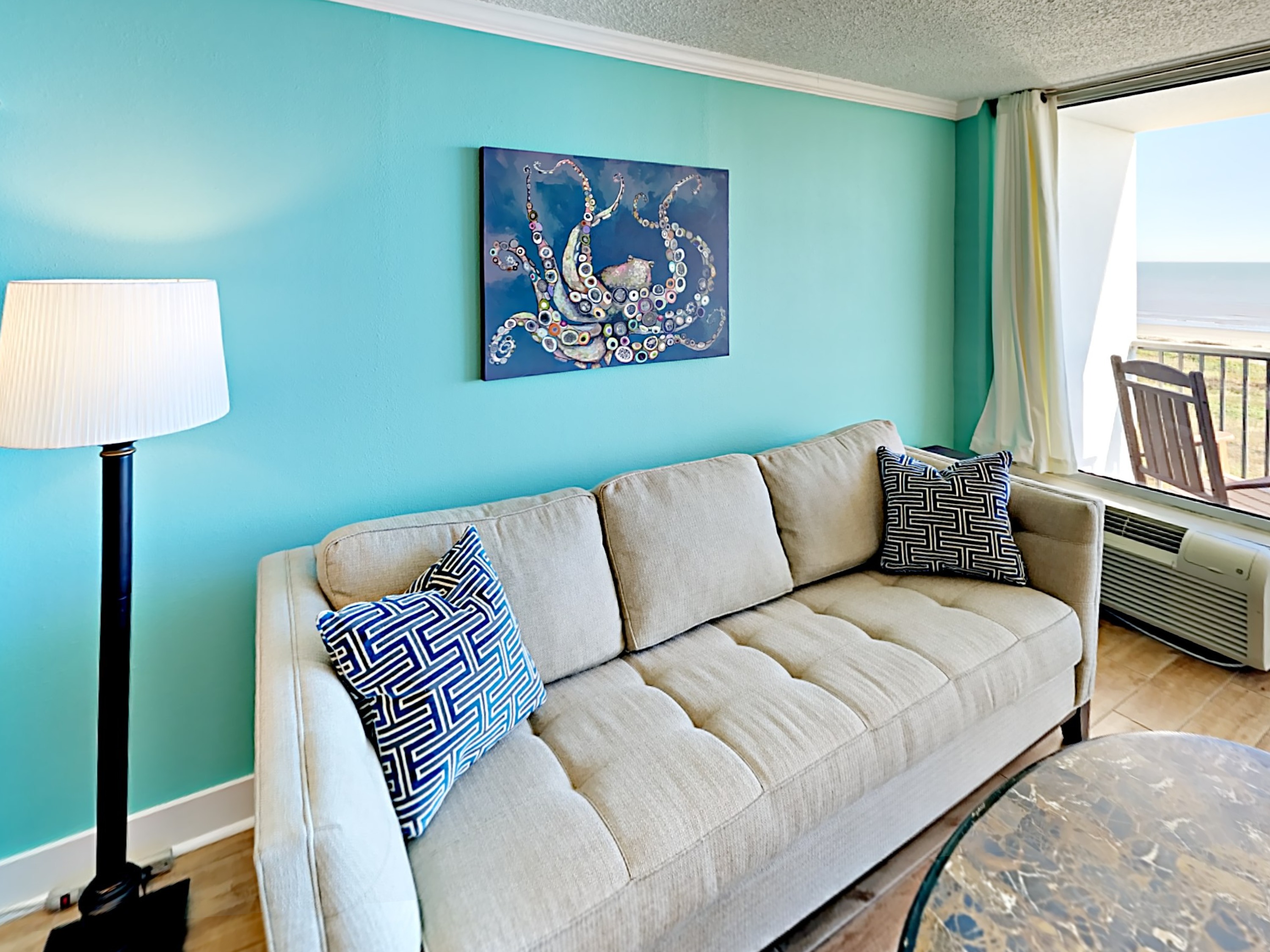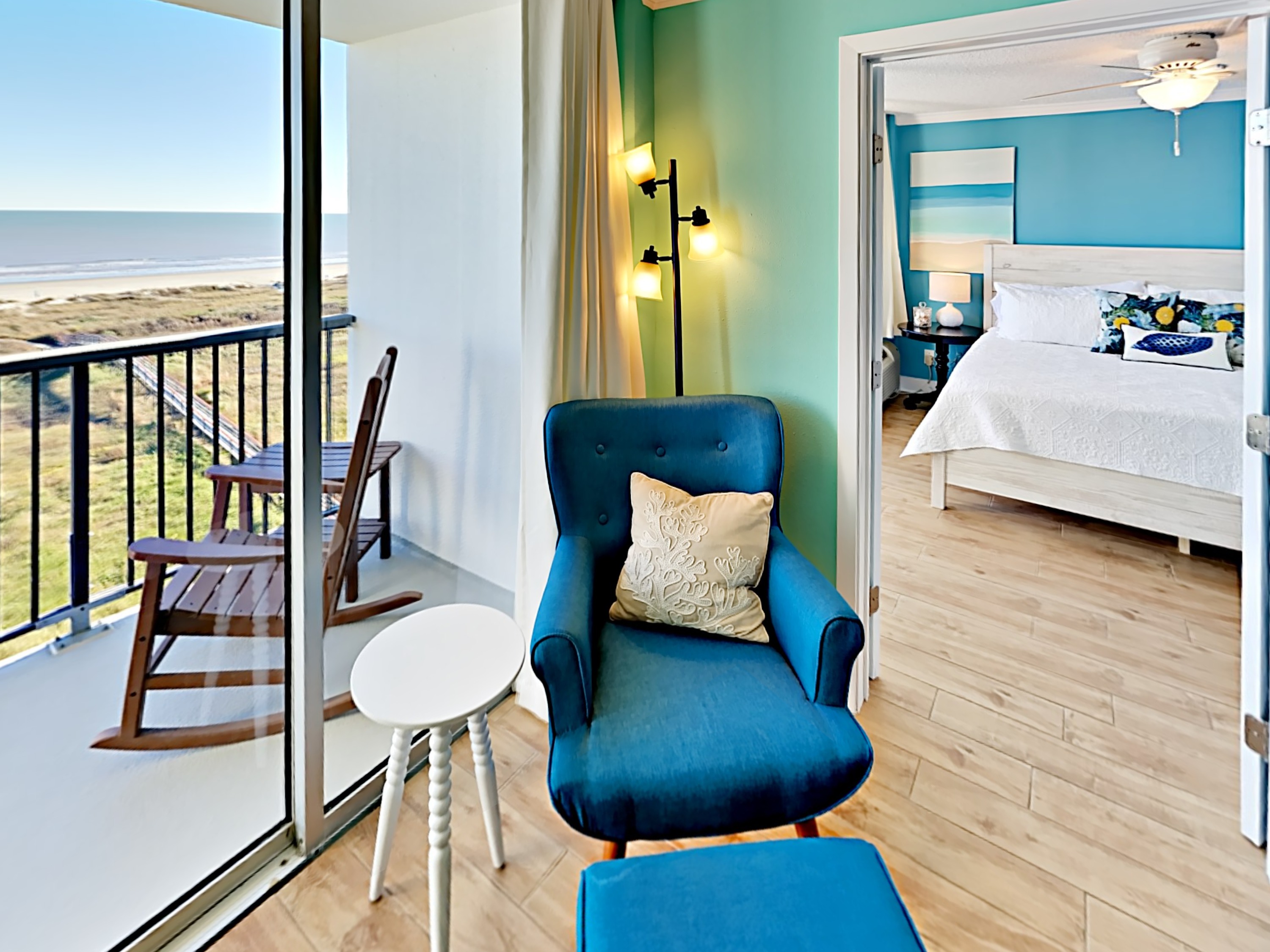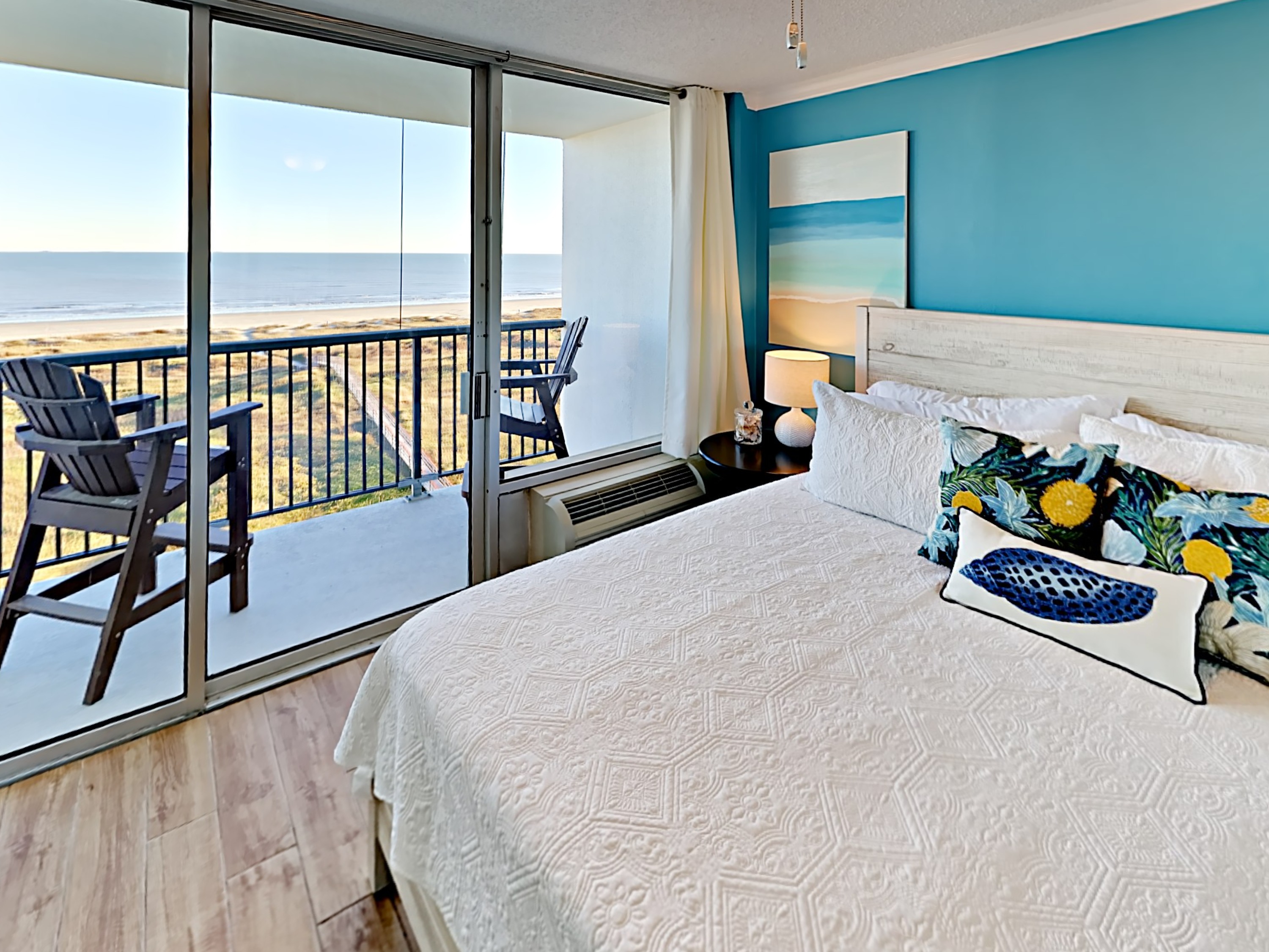The Master Bedroom has a comfy, king sized bed with a private balcony overlooking the dunes and the beach. This bedroom has a relaxed vibe and plenty of room for unpacking.