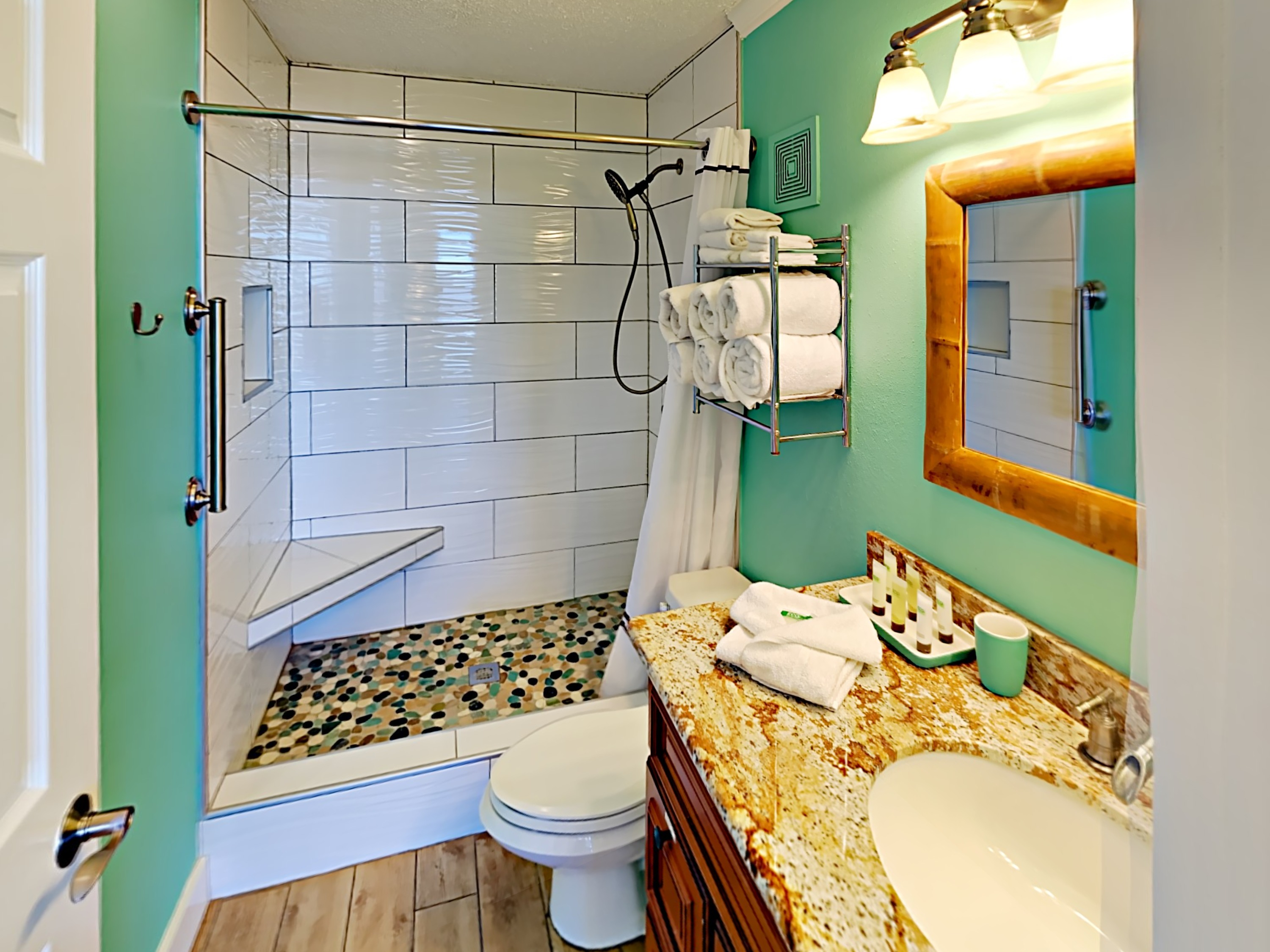 The recently remodeled bathroom has an upgraded, walk in tile shower. Towels are provided as well as starter set of shampoo, soap, and lotion.